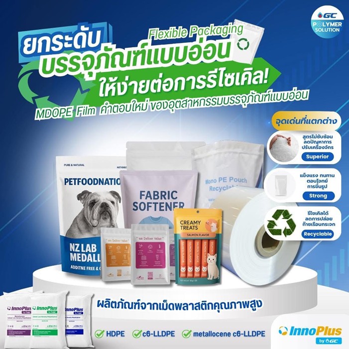 GC has addressed this challenge by developing the innovative Innoplus by GC PE plastic pellets in conjunction with MDOPE (Machine Direction Orientation Polyethylene) film solutions. This involves integrating Machine Direction Orientation (MDO) technology with comprehensive formula and film structure design, spanning from analyzing user requirements, raw material development, to real-world production testing in collaboration with customers.