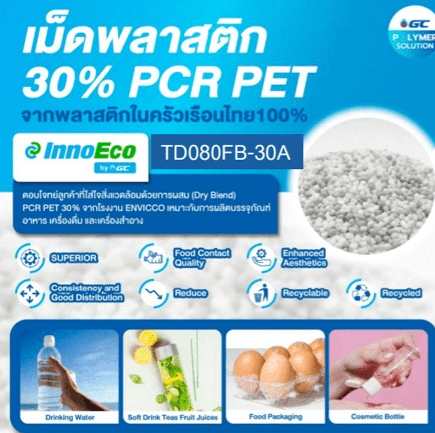 GC has worked in collaboration with Post Consumer Recycled Resin PET (PCR PET) companies to provide a solution for customers who demand products containing 30% PCR PET and pure PET (100%). This project has been conducted with the objective to support market opportunities for PCR PET in Thailand, where consumers and customers currently require 20-30% PCR PET in packaging materials. GC anticipates that this product will generate a revenue 108 million baht per year. It will also accelerate PCR PET market growth to accommodate ENVICCO’s production capacity expansion and build future cooperation with other business sectors.