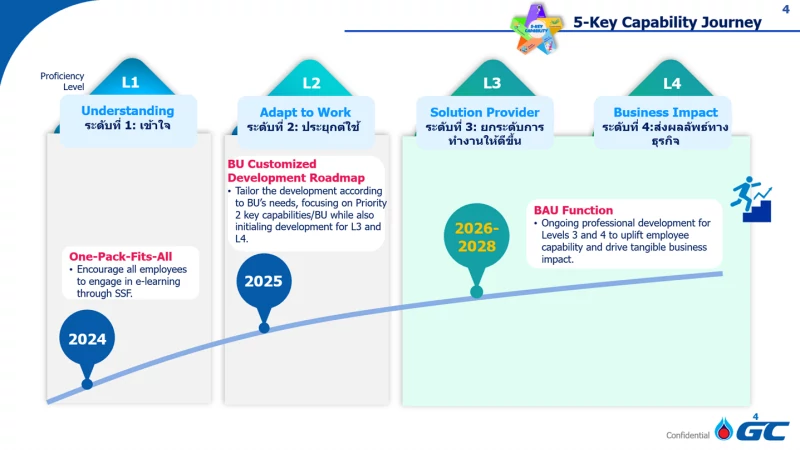 GC determines the business benefits of our investments in employee development programs by applying a third-party methodology, which is Kirkpatrick Model & Phillips ROI Methodology to measure the return on investment for training programs. It takes into account any style of training to determine aptitude based on four levels, including 1) Reaction, 2) Learning, 3) Behavior, and 4) Results. The program in 4th level of the Kirkpatrick Model are calculated Training ROI by using the Phillips ROI Methodology have four phases are 1) Evaluation Planning to develop evaluation plans and baseline data, 2) Data Collection, 3) Data Analysis to isolate the benefit of programs and covert to monetary value for using for ROI calculation, and 4) Reporting to develop report and communicate results. The Training ROI is calculated using the project benefits and costs.