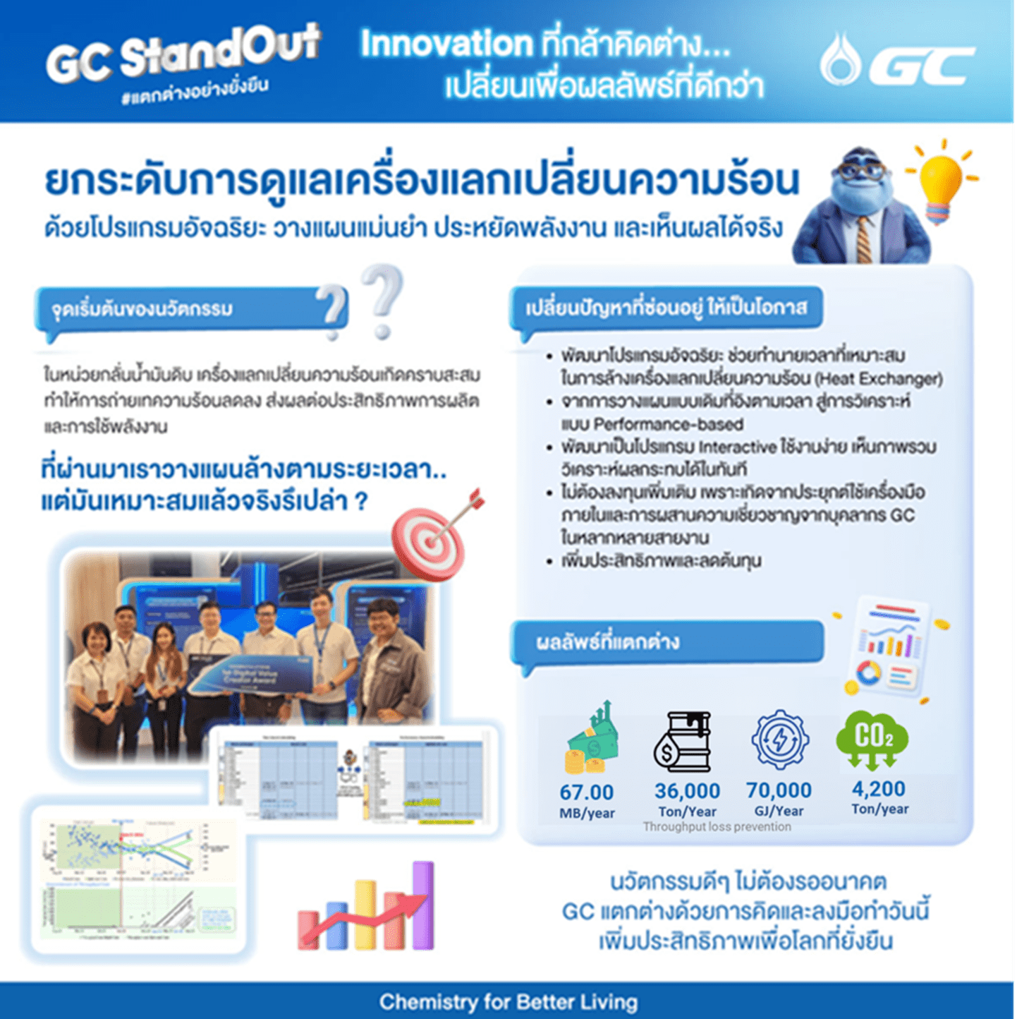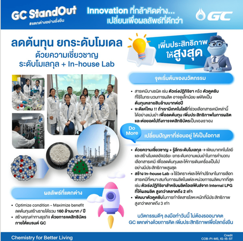 บริษัทฯ ได้พัฒนานวัตกรรมการผลิตโดยใช้ความเชี่ยวชาญระดับโมเลกุลร่วมกับศักยภาพของ In-house Lab เพื่อเพิ่มประสิทธิภาพและลดต้นทุนการผลิตอย่างมีนัยสำคัญ แนวทางนี้มุ่งเน้นการปรับสภาพการผลิตให้เหมาะสมที่สุด (Optimize Condition) เพื่อให้ได้ผลลัพธ์สูงสุด (Maximize Benefit) โดยใช้การวิเคราะห์เชิงลึกและเทคโนโลยีขั้นสูงในการแก้ไขปัญหาที่เกิดขึ้นในกระบวนการผลิต ซึ่งมีจุดเด่นในการใช้การทดสอบและวิเคราะห์เชิงลึกในระดับโมเลกุลเพื่อปรับปรุงกระบวนการผลิต ลดการสูญเสียพลังงานและเพิ่มประสิทธิภาพการใช้วัตถุดิบ และปรับสภาพการทำงานของเครื่องจักรให้เหมาะสมที่สุด โดยนวัตกรรมดังกล่าวสามารถสร้างคุณค่าทางธุรกิจ ผ่านการจดสิทธิบัตรภายใต้แบรนด์ GC