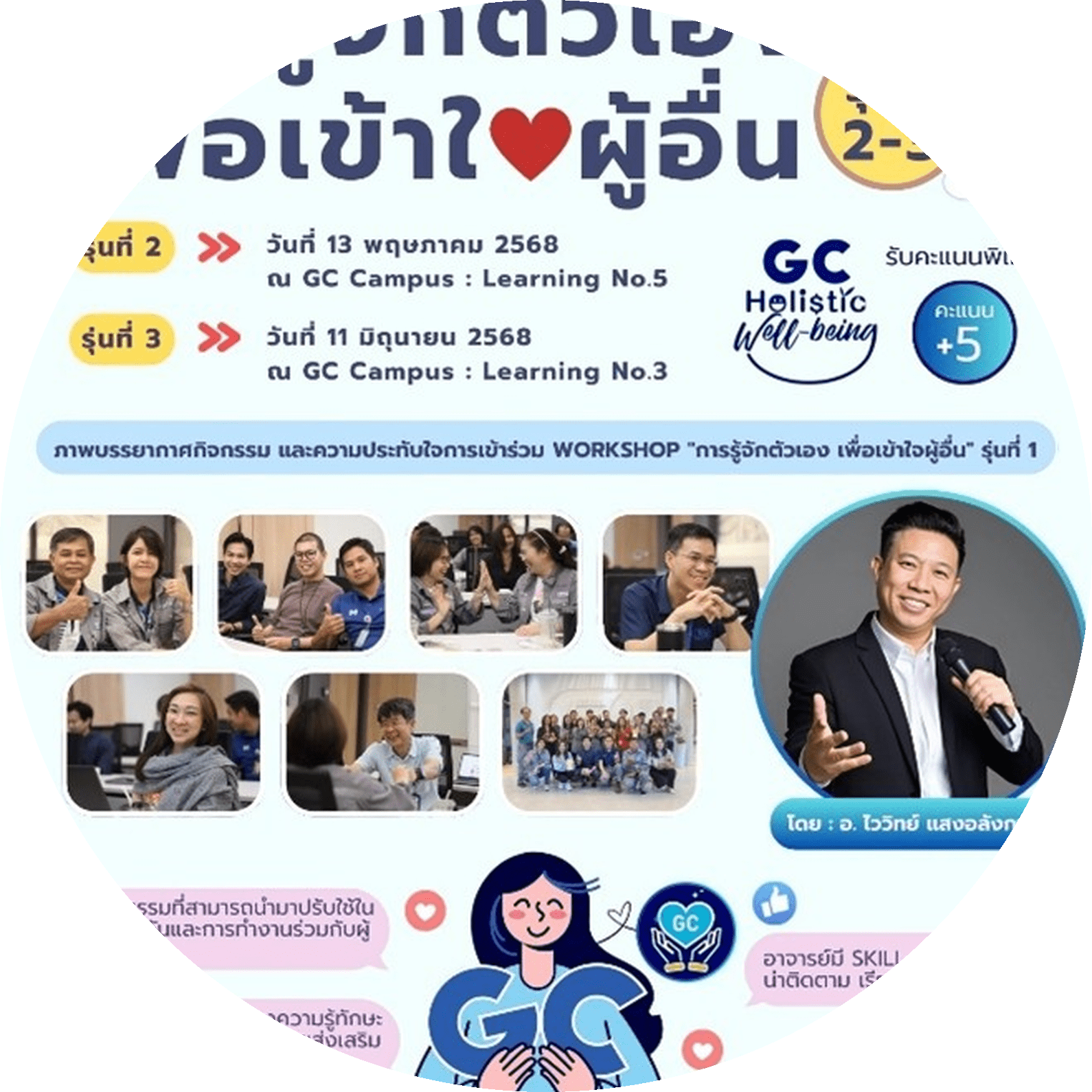 จัดกิจกรรมให้ความรู้และ Workshop เพื่อส่งเสริมให้พนักงานได้เรียนรู้ เข้าใจตนเองและผู้อื่น เพื่อให้การสื่อสารและทำงานร่วมกันได้อย่างมีประสิทธิภาพมากขึ้น